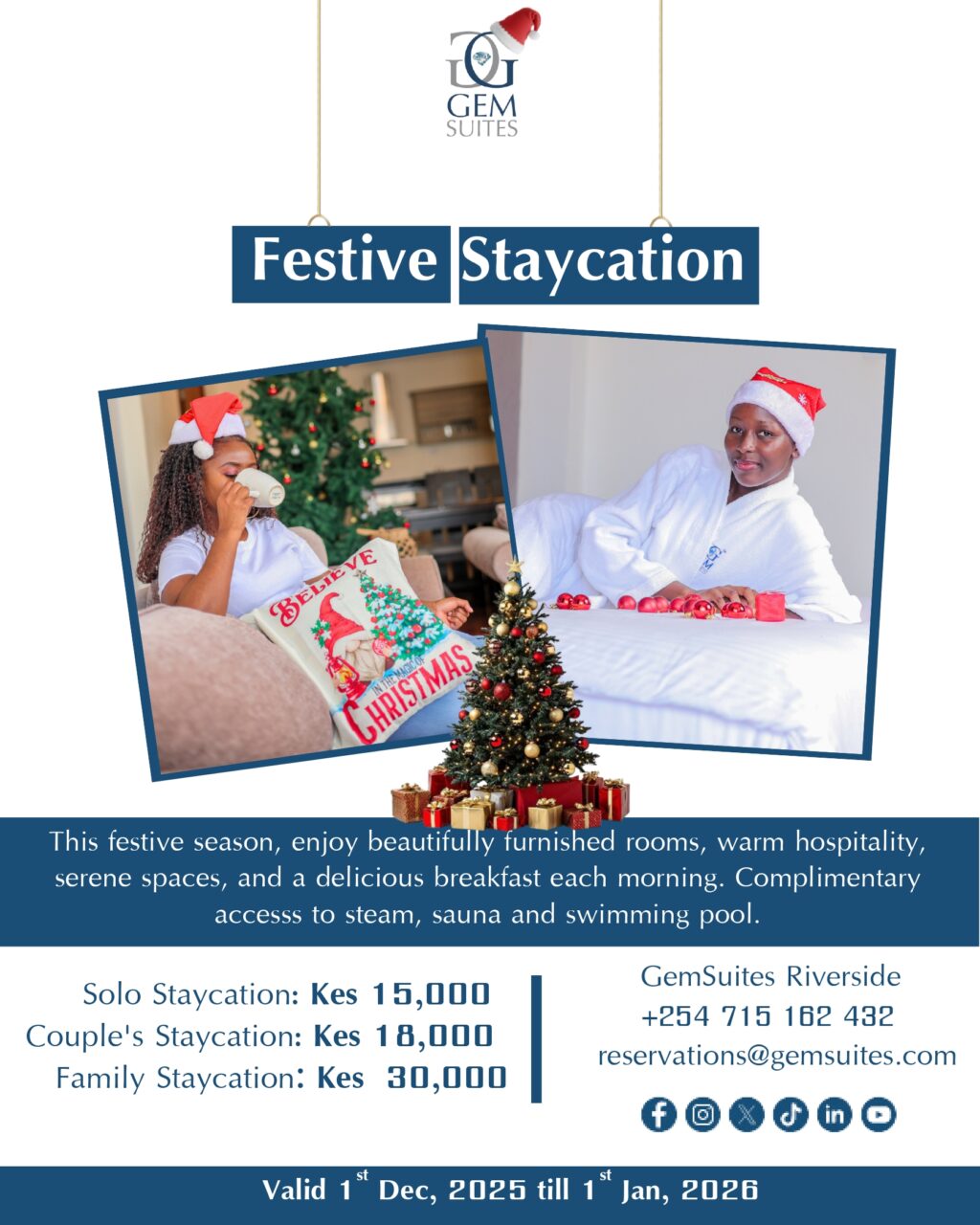 Experience festive comfort, flavour, and calm at GemSuites Riverside this December. From 1 December 2025 to 1 January 2026, enjoy beautifully furnished rooms, warm hospitality, serene spaces, and a delicious breakfast each morning, with complimentary access to the steam room, sauna, and swimming pool. Choose from solo, couple, or family staycations with rates starting at Kes 15,000.