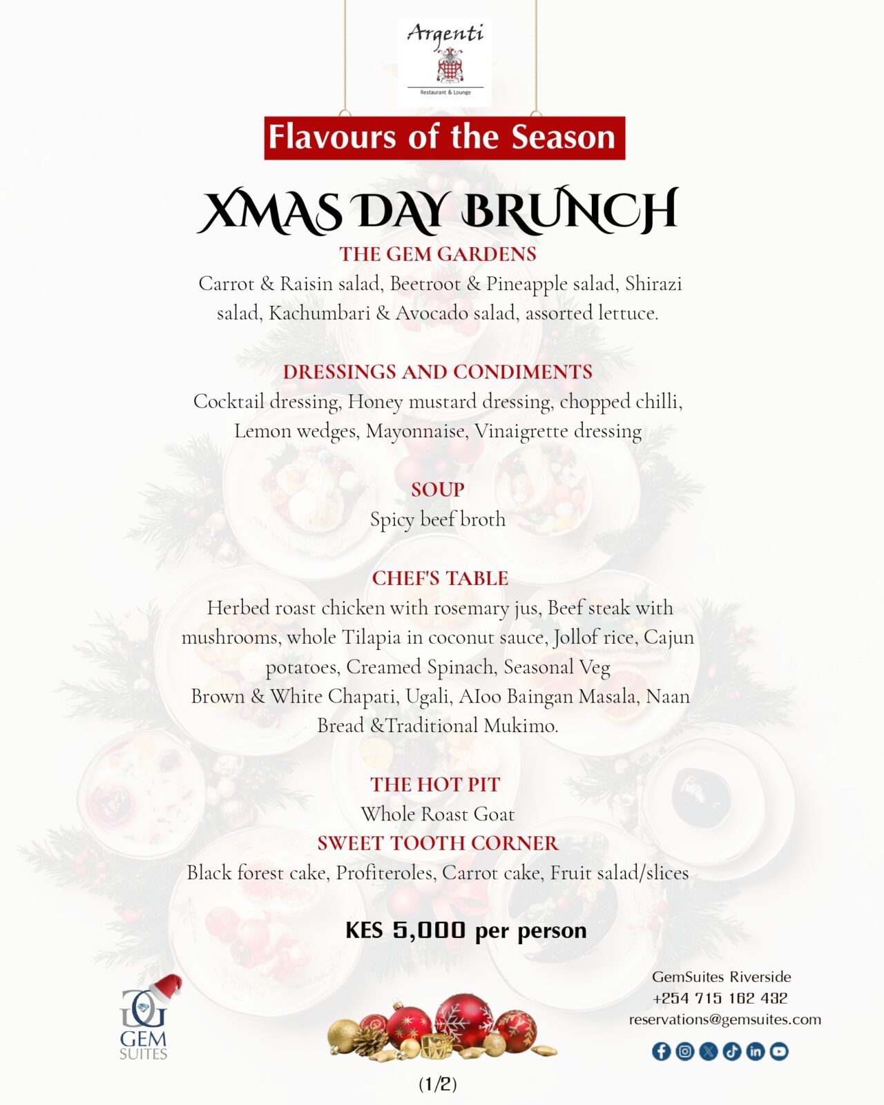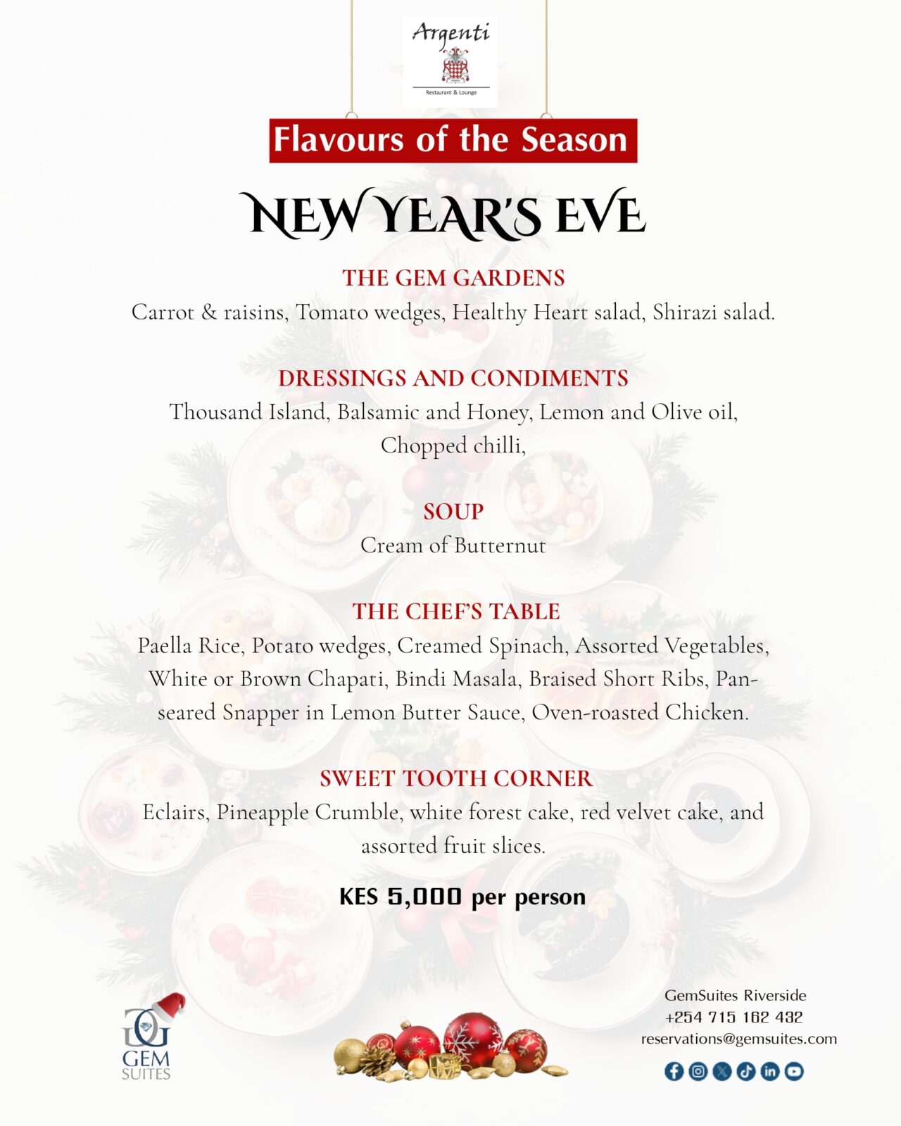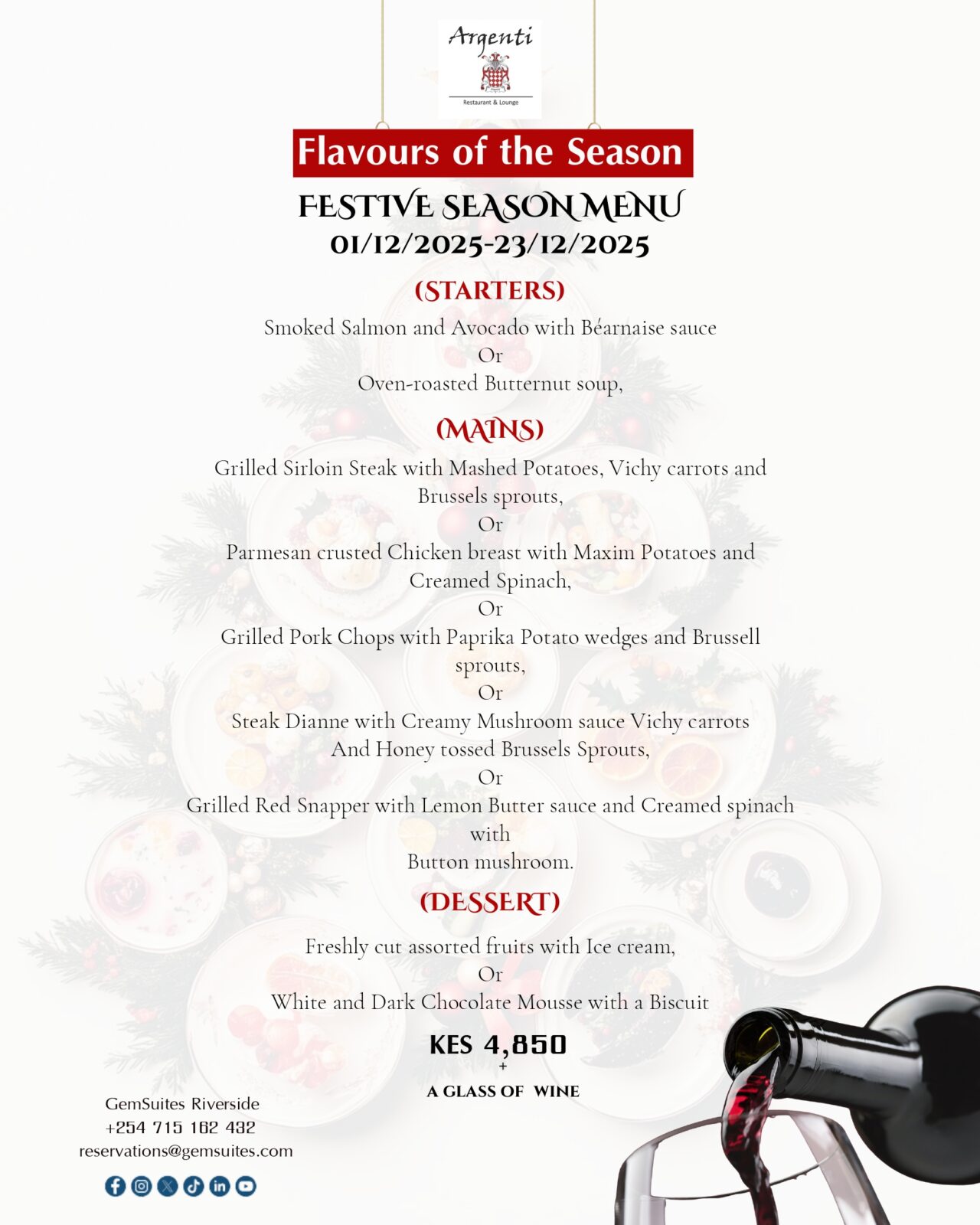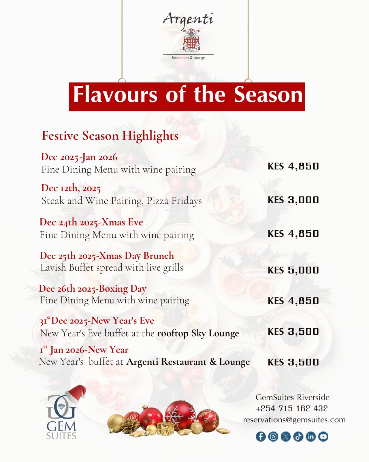 These include the Jamhuri Day Special, Christmas Eve Dinner, Christmas Day Brunch, Boxing Day dining, New Year’s Eve celebrations at the Sky Lounge, and a New Year’s Day buffet at Argenti.