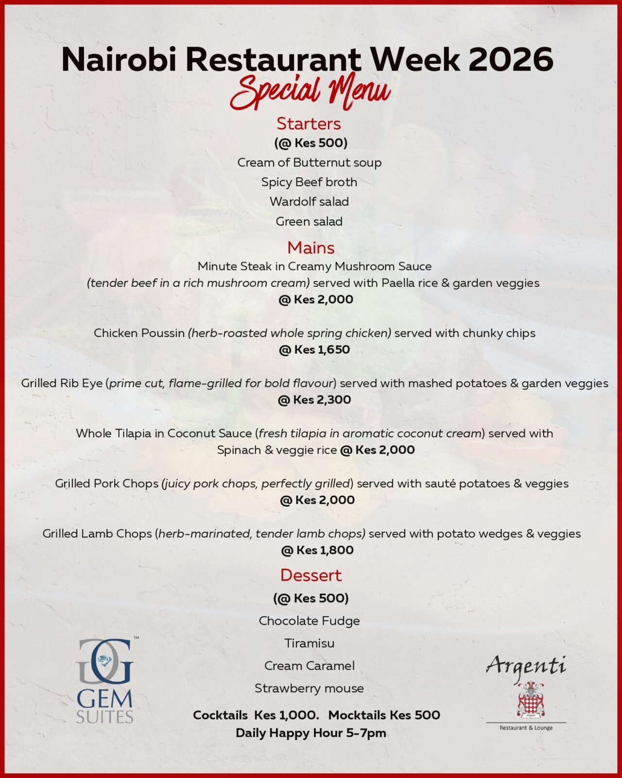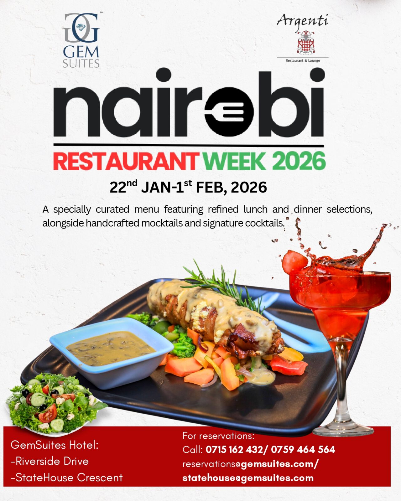 Join us at our Riverside Drive and State House Crescent branches for Nairobi Restaurant Week 2026, running from 22nd January to 1st February.