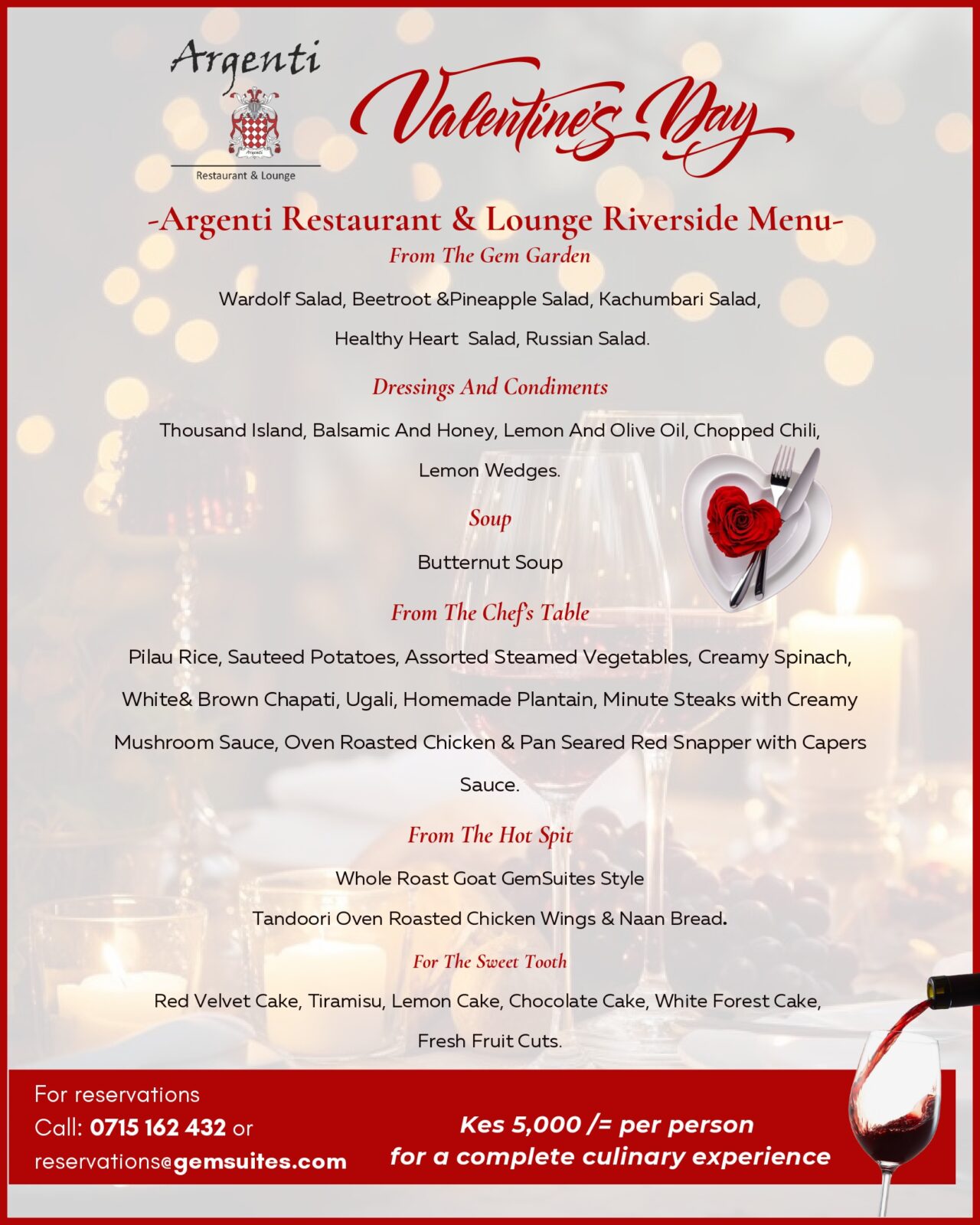 - Couple’s Accommodation: KES 30,000 per couple (Includes a bouquet of flowers, a bottle of wine and chocolates)